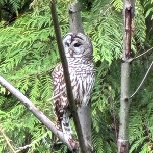 This barred owl perched outside our sliding back door. It was watching squirrels stealing food I had put out for songbirds. I’ve never seen an owl catch a squirrel. To do so, an owl would need to surprise the squirrel in darkness because squirrels are lightning fast and owls are slow. That’s probably why squirrels don’t come out at night. This owl was wise enough to know this and so watched the unconcerned squirrels from a mere forty feet.